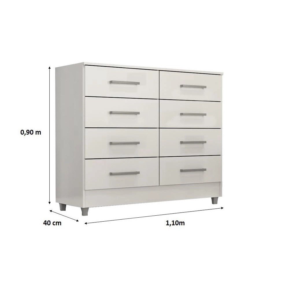 Cômoda raissa Com 8 gavetas dispõe de um design sofisticado é própria para pessoas exigentes com organização. As gavetas possuem corrediças metálicas, fazendo assim com que a gaveta não caia na hora que você for utilizar, evitando acidentes com crianças. O móvel suporta pesos de até 7kg em suas gavetas e 20kg no tampo suficiente para acomodar televisores, além disso acompanha pezinhos para melhor limpeza e durabilidade do produto. As gavetas são espaçosas e comportam um bom volume de roupas e acessórios em seu interior. Possui acabamento Touch Alto-Relevo ou Alto Brilho uv e Semibrilho parte interna. Tem um design moderno que ao mesmo tempo atende muito bem as reais necessidades de uma ou duas pessoas. Além desses detalhes é de fácil montagem. Altura 0,90m x Largura 1,10m x Profundidade 0,40m x Peso 37kg