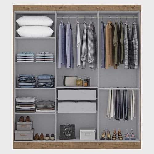 A parte interna conta com cabideiros e calceiros de madeira com padrão na cor cinza, 5 prateleiras e 2 gavetas de corrediças metálicas com pintura epóxi, material que proporciona maior resistência e proteção ao produto.!