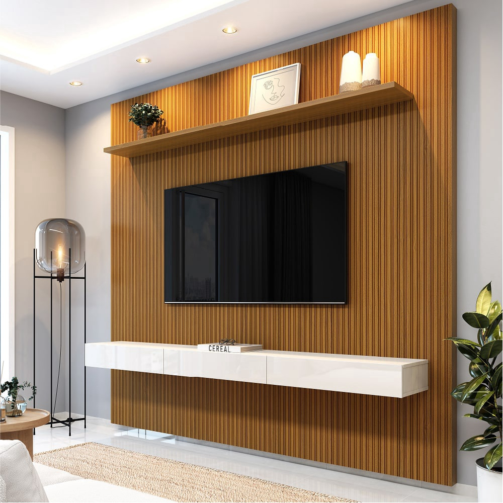 Painel Para Tv Até 75 Polegadas Ripado Impressão 3D Egeo Com Nicho 2,25m Cedro Off White edn