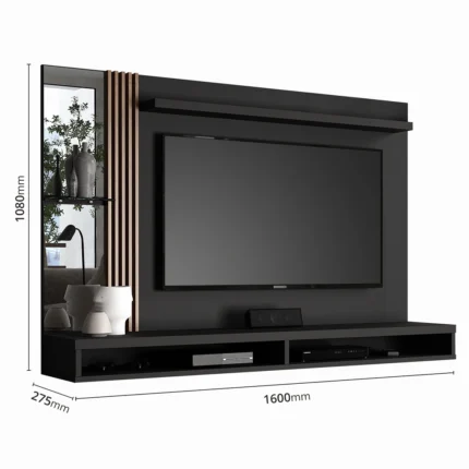 O Conjunto Ouro Preto foi projetado para TV de até 75 polegadas, contendo painel ripado e fita de Led que deixam a sua sala ainda mais moderna. Além disso, acompanha prateleiras para dispor objetos decorativos. Possui ainda gavetas e portas de abrir, facilitando o armazenamento e organização de pertences.